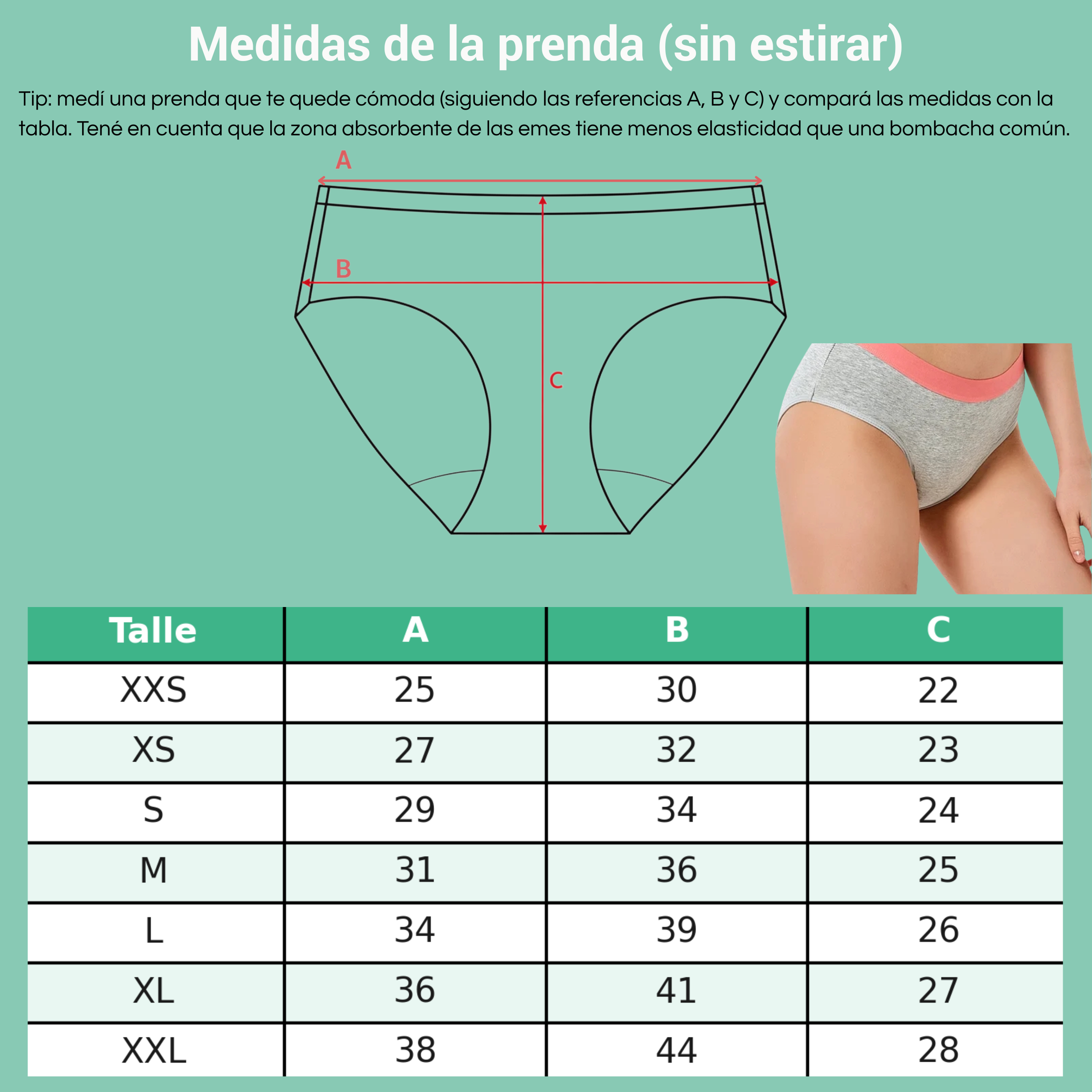 - Talles pequeños, ajuste perfecto para quienes necesitan una bombacha menstrual reducida